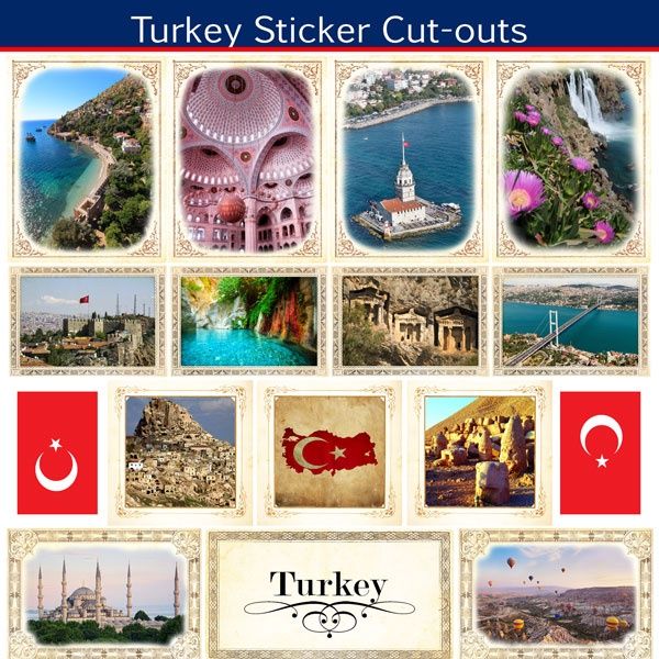 Sticker sheet includes 16 pictures, symbols, and iconic images, including 2 of the Turkey flag.